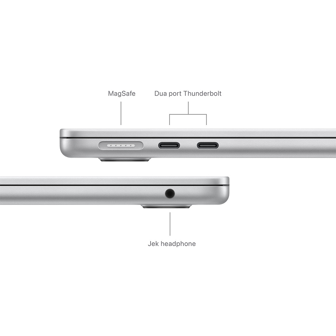 • TERHUBUNG — MacBook Air dilengkapi dua port Thunderbolt, jek headphone, Wi-Fi 6E, 4 Bluetooth 5.3, dan port pengisian daya MagSafe. Dan terhubung ke hingga dua layar eksternal dengan layar laptop tertutup.